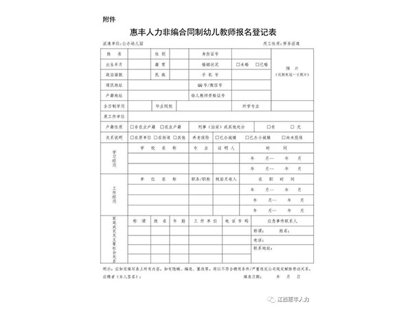 為滿足我市公辦幼兒園師資需求,我公司面向社會公開招聘一大批非事業(yè)編合同制幼兒教師,以勞務派遣的方式與用人單位進行勞動力資源開發(fā)合作?,F(xiàn)將有關事項公告如下:一、招聘人數(shù)及崗位我市招聘非事業(yè)編合同制幼兒教師50名,具體崗位在選崗前公示。二、招聘方式通過第三方勞務公...